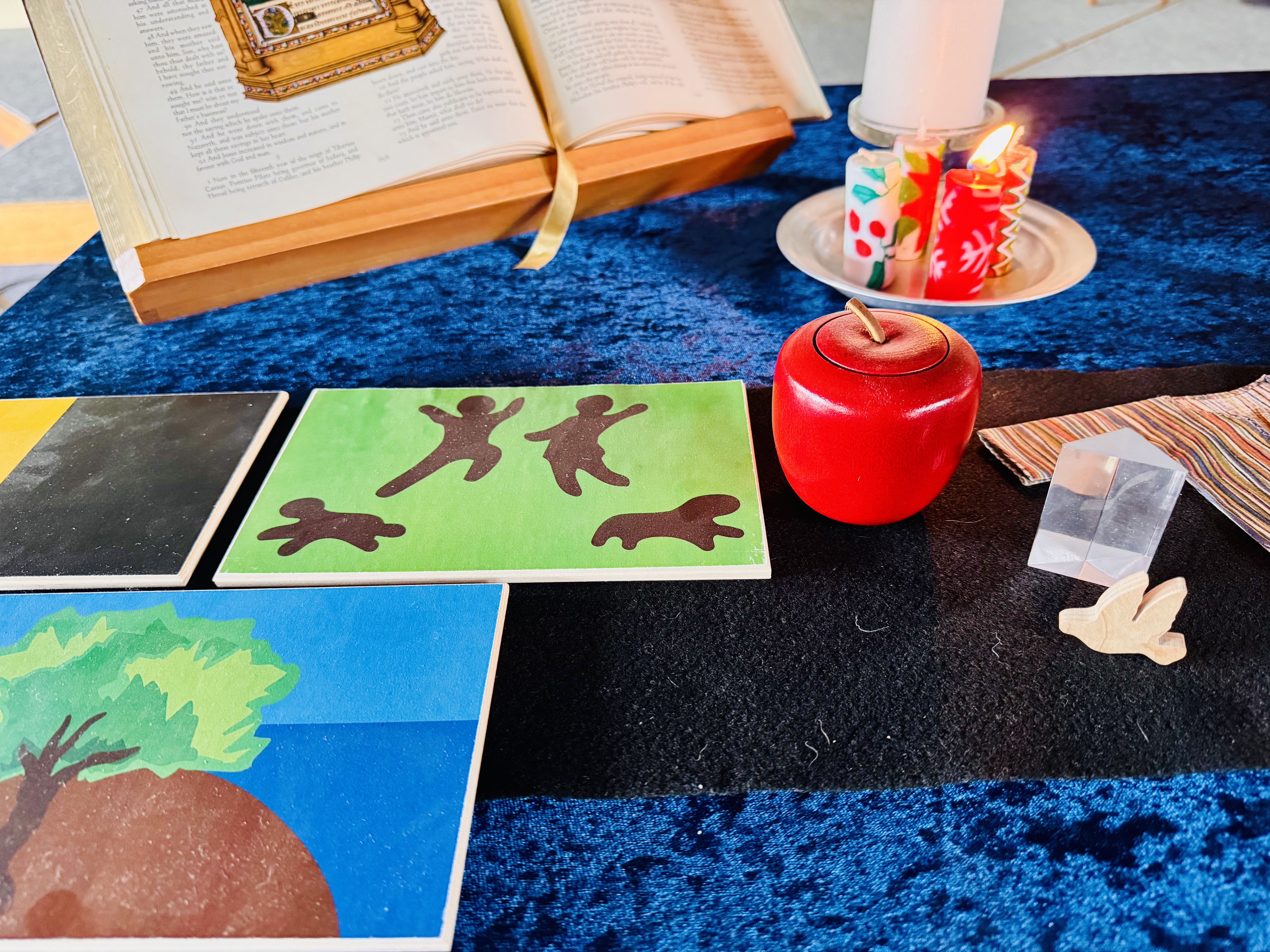Each week, congregants are offered a liturgy booklet that follows the same format and rituals, with elements like the poem/prayer, Bible reading, and wondering questions changing. The sermons are inspired by the “living stories” method and involve an unfolding visual scene that participants are able to interact with through wondering, touch, and silent reflection after.