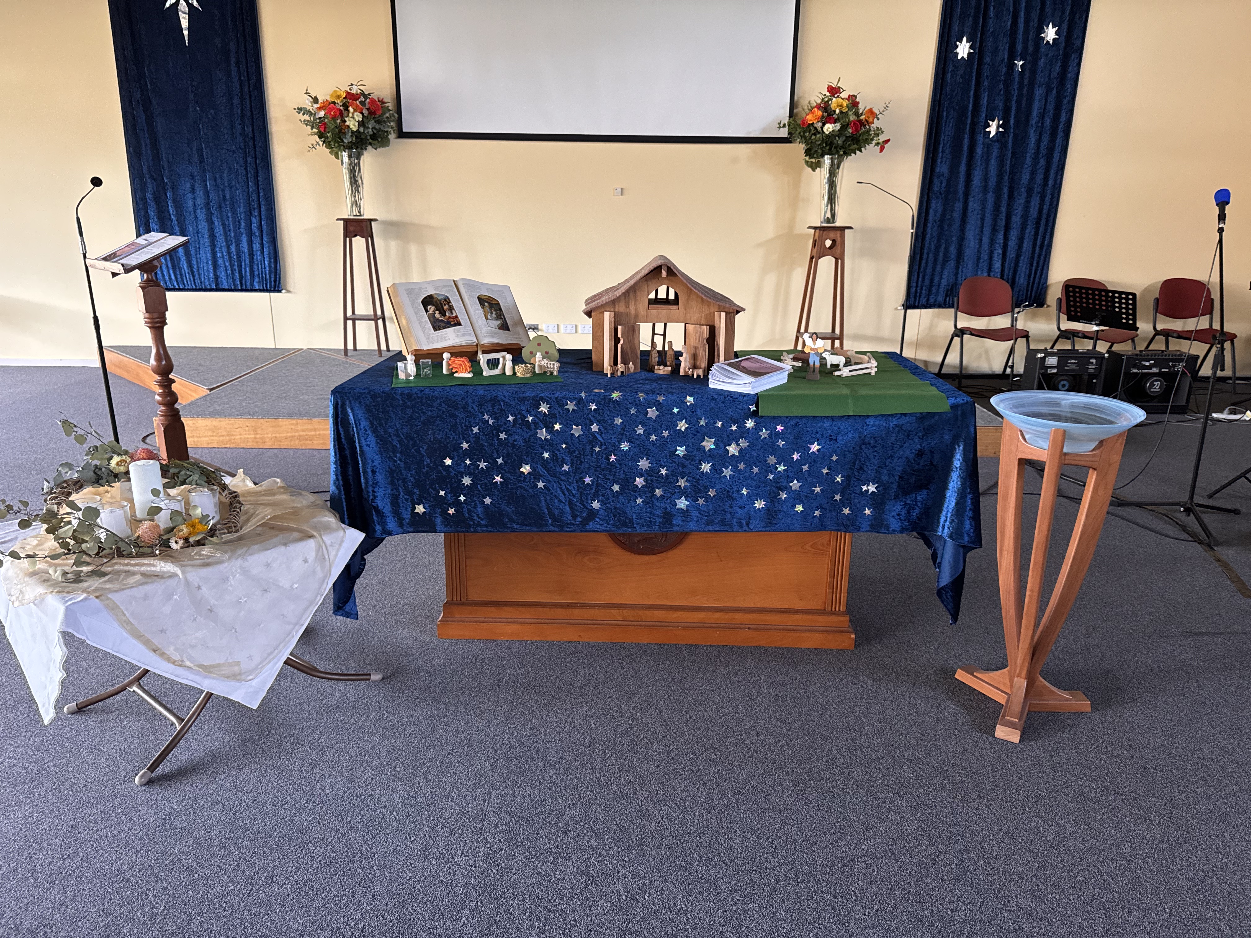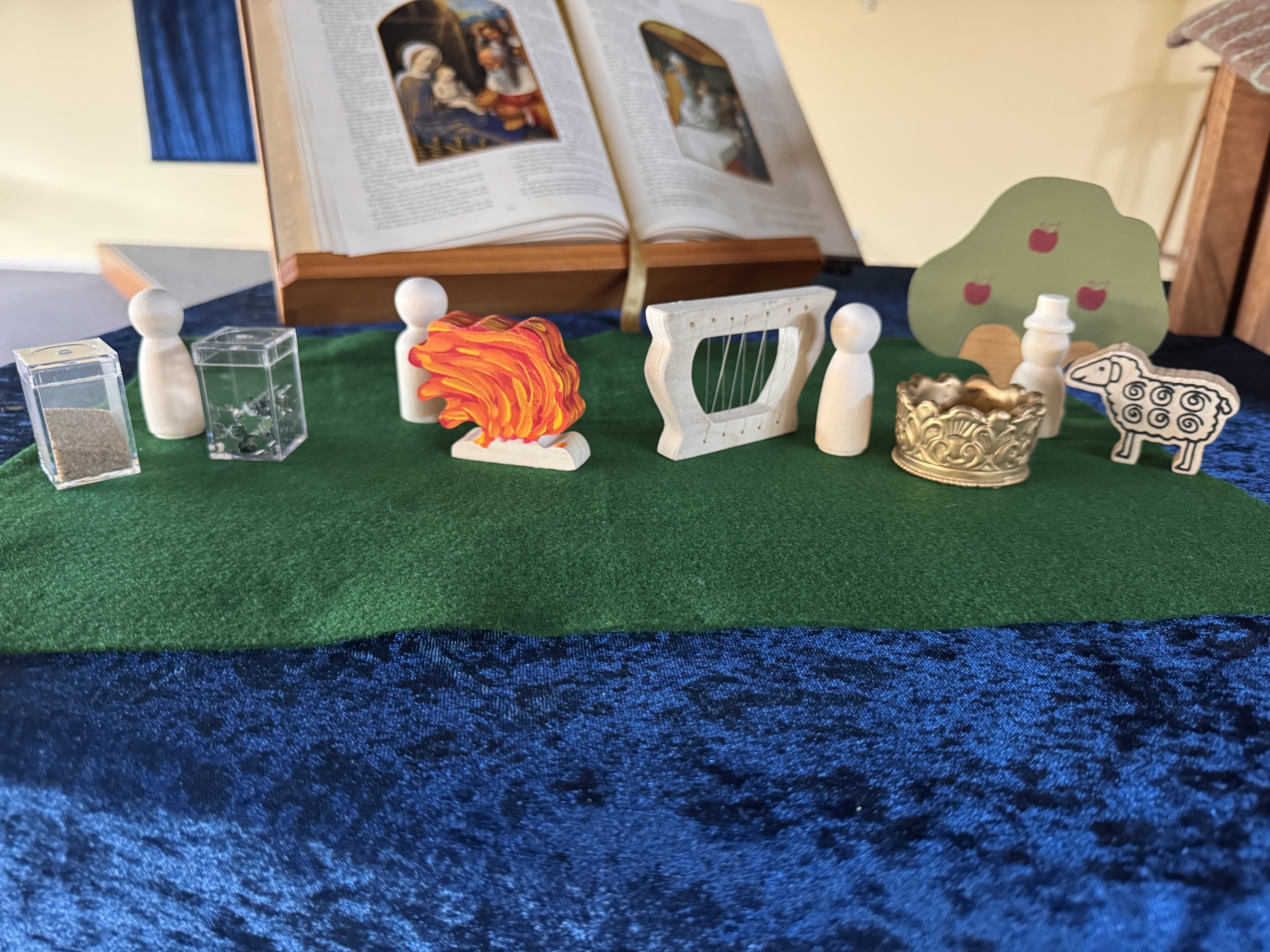 Each week, congregants are offered a liturgy booklet that follows the same format and rituals, with elements like the poem/prayer, Bible reading, and wondering questions changing. The sermons are inspired by the “living stories” method and involve an unfolding visual scene that participants are able to interact with through wondering, touch, and silent reflection after.
