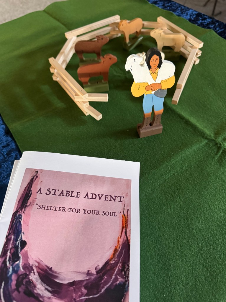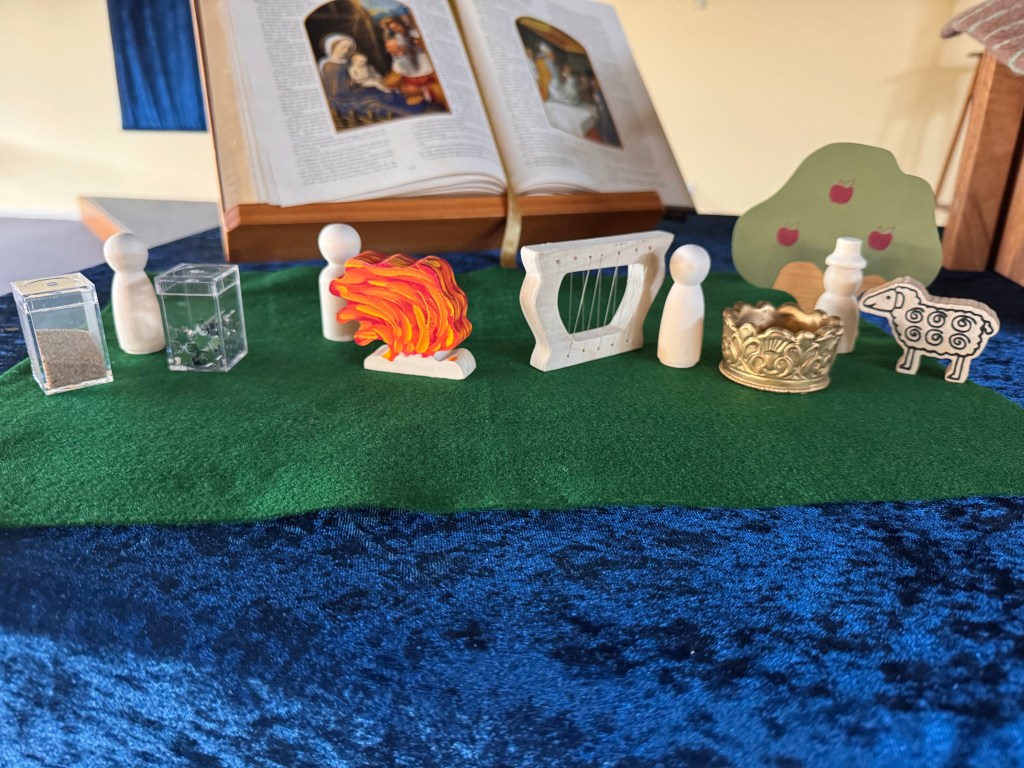 Unpack the elements for World Communion Sunday – sheep, shepherd, gate and pen slowly and set out on the green felt on the right
