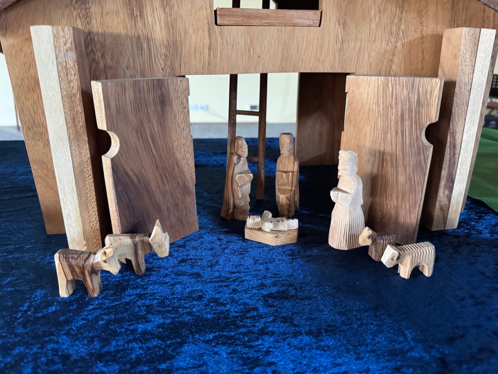The table is set with a stable in the centre and green felt underlays to the left and the right. The doors are open and figures representing Mary and Joseph and the baby Jesus stand within.