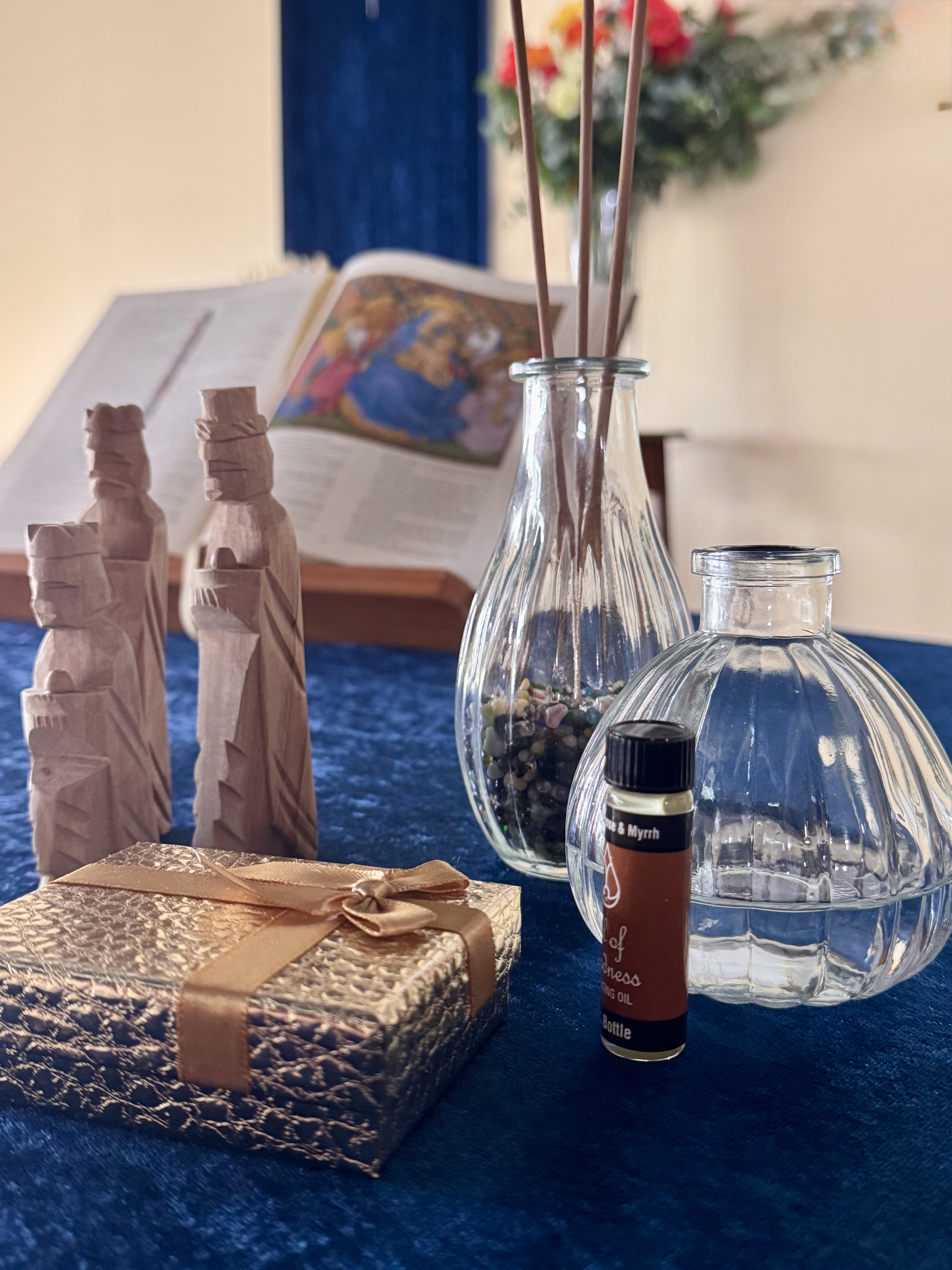 with precious gifts of gold, frankincense, and myrrh in their hands